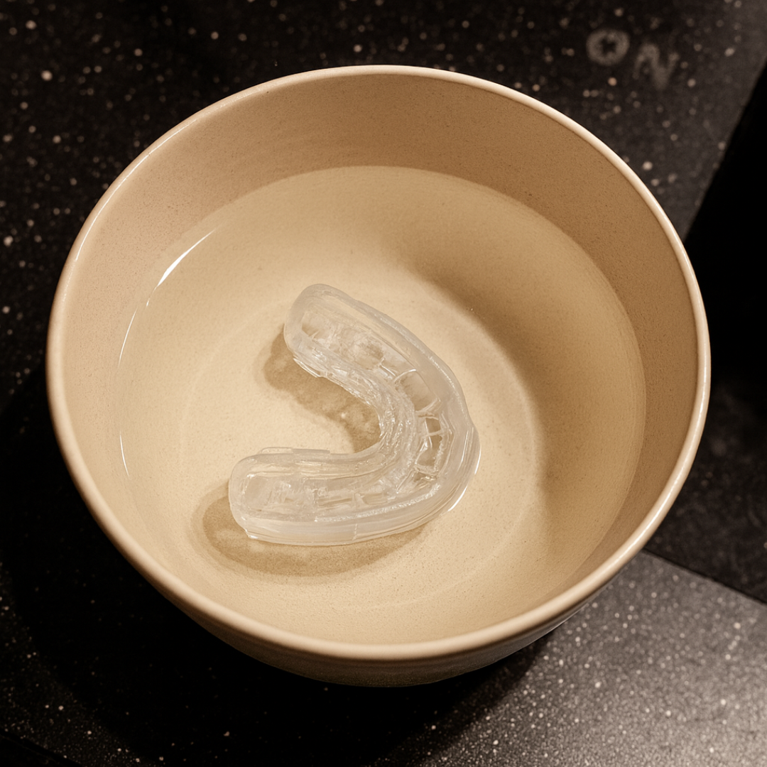 🦷 Plongez-le dans de l'eau chaude (90 sec max). Une fois refroidi, mordez fermement pour l'ajuster à vos dents. Plongez-le ensuite dans de l'eau froide pour fixer l'empreinte.